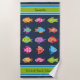 Celebrar as férias de verão passadas na areia ou viagens à piscina local com esta toalha de praia personalizada que apresenta peixes tropicais coloridos, listras costeiras, um nome personalizável, mais espaço para texto adicional. Este design unisexo é jovem e divertido, e vai apelar a rapazes, raparigas e crianças de todas as idades. Adicione um nome e seu próprio texto para criar um presente único para crianças que se divertem ao sol.
