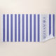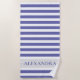 Chic cabana stripe beach towel with blue violet shade) and white striped pattern. Light gray band with your name.
