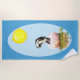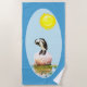 Um pequeno pinguim está sentado sobre uma rocha redonda em uma piscina de marés, com a cabeça curvada enquanto dorme, com o sol quente escondido sobre ela. A pintura digital está em forma oval longa. Imagem Copyright ©2017 Kimberly J Tilley.