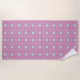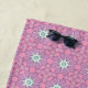 A bathroom set featuring pink towels with a geometric pattern of blue flowers and hexagons. Includes a hand towel and matching washcloth.