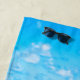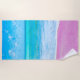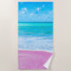 Esta linda toalha de praia apresenta uma linda fotografia de uma praia tropical com areia rosa.