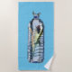 Legal toalha de praia, com trabalho de arte gráfico de um tubarão branco excelente preso em uma garrafa d'água, contra um fundo azul de onda espiral. Personalize para adicionar seu próprio texto.