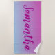 Perfeito para o verão, esta toalha de praia cor doce e doce de algodão roxo e azul é um sonho realizado. Apresentando um fundo azul e roxo colorido ombre, insira seu nome no modelo usando uma fonte colorido púrpura. Peça sua toalha de praia hoje!
