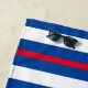 Esta toalha vermelha branca e azul de praia apresenta cores patrióticas nos EUA. Use esta toalha para sua celebração de 4 de julho, para a praia, ou lago. Esta toalha colorida é perfeita para feriados e para uso durante todo o verão.