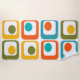 Esta toalha de praia tem um design moderno do século médio de quatro retângulos arredondados em quatro filas com ovais dentro em laranja, amarelo, verde e turquesa.