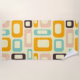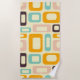 Retro geometric pattern with overlapping rectangles and ovals in orange, teal, pink, and brown on a light beige background, creating a playful, vibrant mood.
