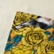 Padrão vetorial desenhado à mão com rosa e pássaros dourados. Todos os elementos do padrão são desenhados primeiro com tinta no papel e depois redesenhados e coloridos no Illustrator.