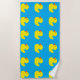 Beach towel with rows of cute yellow rubber ducks against a blue background.