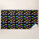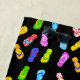 Esta bela toalha de praia apresenta um adorável padrão de sandálias de flutuação de sacudir em diferentes cores e padrões num fundo preto.