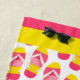 Esta design apresenta um pequeno padrão maluco feito de chinelos retirados. Estes calçados de praia divertidos, com suas listras cor-de-rosa e amarelas estão atravessando esta toalha. As bordas superior e inferior têm faixas de coordenação de cores.