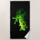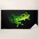 Uma toalha de praia divertida com um sapo verde fraturado com olhos laranja contrastantes sobre fundo preto.