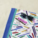 School supplies pattern with old school sticker style name tag. Make it yours.