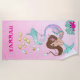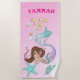 Uma toalha de nome pessoal fofa com Sereias com cabelos escuros e criaturas submarinas, Mude o nome das suas toalhas pessoais de banheiro.