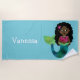 Toalha de praia personalizada das meninas da sereia da folha do falso do afro-americano. A sereia pequena adorável com falso foil a cauda verde, a camisola de alças cor-de-rosa magenta e a estrela do mar cor-de-rosa em seu cabelo preto escuro. Personalize com nome no branco em um fundo bonito do azul de oceano. Personalize à cor ou à pia batismal do fundo da mudança. www.SamAnnDesigns.com