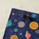 Um padrão divertido e moderno do sistema solar com ilustrações coloridas de planeta, estrelas e sol contra um fundo azul escuro.