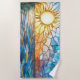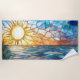 Wrap yourself in coastal charm with this vibrant beach towel featuring a stained glass–style ocean sunset. The design captures the golden sun, glistening waves, and soft shoreline in warm amber, deep blue, and shimmering aqua hues — perfect for beach days, pool lounging, or adding ocean vibes to your bathroom décor.