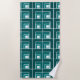 Esta toalha de praia tem um design geométrico feito de Ls em tons de chel dispostos em diferentes direções se repetindo na design.