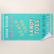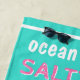Bonito fundo azul azul-turquesa com faixas brancas geométricas. Típica divertida da praia, incluindo areia da praia, brisa oceânica, conchas em várias fontes em branco, rosa, bronzeado e azul. Listras brancas geométricas em cada extremidade. Design original de TamiraZDescartazes.