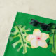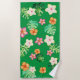 Sentir-se-á sempre como se estivesse nos trópicos com toalha de praia de impressão tropical. Esta design tem folhas verdes e flores coloridas escamosas sobre um fundo verde escuro.