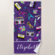 Se você ama os anos 80, você vai adorar essa toalha de praia. Usando um fundo roxo, este item é adornado com fitas de cassetes coloridas, instrumentos musicais, etc. Personalize seu nome, texto ou fotos na parte inferior. Peça o seu hoje!
