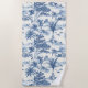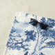 A imagem retrata um padrão clássico de mosaico de Jouy, caracterizado por cenas detalhadas em azul sobre fundo branco. Apresenta paisagens tropicais com palmeiras exuberantes, terreno rochoso e massas de água serenas. Há elementos como cabanas pequenas, pássaros em voo, e ilhas distantes, dando ao design uma sensação idílica e pacífica. O padrão é intrincado e evoca uma sensação de elegância pastoral tradicional muitas vezes associada às artes decorativas francesas.