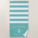 Adicione um toque personalizado único à sua casa de praia com nossas toalhas de praia personalizadas. Design apresenta listras náuticas clássicas em turquesa e branco com o nome da sua família, "casa de praia" e o ano estabelecido, acompanhando uma corda náutica branca e a ilustração da âncora.
