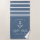 Toalhas de praia azuis combinando para sua despedida de solteira náutica ou de barco apresentam uma ilustração de âncora de navio branca encimada por um pequeno coração, com duas linhas de texto personalizado abaixo; mostrado com "Última Viagem Antes do Véu". Adicione o nome da noiva curvado na parte superior. As cores podem ser alteradas para combinar com suas cores preferidas usando a ferramenta de design da Zazzle.