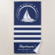 Toalha de praia azul náutica e branca listrada para chá de noiva / festa de despedida de solteira com veleiro e a frase "última viagem antes do véu". Personalize com os detalhes do seu evento.