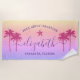 Design personalizado de toalha de praia para uma fuga de praia para meninas, apresenta um nome personalizado em um roteiro moderno, acentuado com estrelas-do-mar e enquadrado por palmeiras tropicais. Personalize com um nome e texto personalizado para a ocasião especial. O plano de fundo inclui um bonito gradiente do pôr do sol em cores amarela, coral, rosa, violeta e roxa.