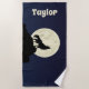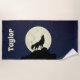 Mostre seu lado selvagem com esta toalha de praia personalizada. Ele apresenta uma ilustração ao estilo da silhueta de um lobo em preto uivando em uma lua amarela pálida contra um fazer de fundo do céu azul-da-noite perfeito para qualquer um que ama animais. Esta toalha está pronta para ser personalizada com um nome ou outro texto em letras amarelas a negrito.