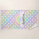 Esta adorável toalha de praia apresenta um fundo pastel de xadrez gingham arco-íris com um arco-íris pastel. Personalize com o nome do seu filho.