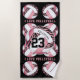 Esta toalha de praia de vôlei para raparigas apresenta um padrão de volebolas listradas de zebra selvagens organizadas em padrão espelhado - em cada vôlei, os painéis de listras-zebra mais três outros painéis têm um tema cor-de-rosa que contrasta com os restantes painéis brancos de vôlei - o texto "EU AMO VOLLEYBALL" a rosa estende-se entre as linhas de bolas de voleiro padronizadas - o seu nome e número de camisa são personalizáveis vôlei maior, assim como a cor de fundo preto - por katz_d_zynes