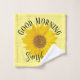 Foto de um girassol amarelo brilhante com texto "Bom dia, sol-sol" sobre fundo amarelo-claro. Se quiser, substitua a palavra "Sol" pelo seu nome ou outro texto.