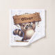 Esta divertida toalha de banho personalizada para crianças apresenta um guaxinim gorducho fofo segurando uma placa de nome de madeira superdimensionada, Com um rabo fofo esticado para equilibrar, e um pé levantado no meio da queda, este design adorável é perfeito para personalização.