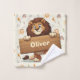 Este vestido de lavagem personalizado divertido apresenta um leão bonito segurando um sinal de nome de madeira de tamanho excessivo.