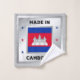 The national flag of Cambodia is central to the design. There are decorative stars on either side of the flag, and they are in the colours of the Cambodian flag. The design is completed by a faux silver background.