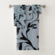 Este fino conjunto de toalhas florais apresenta um padrão repetitivo de uma rosa vermelha perfeita de escarlate solteiro com três folhas verdes sobre um fundo preto.