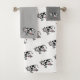 Este conjunto de toalhas de excelente apresenta um desenho animado divertido de uma vaca negra e branca. Na toalha de banho, a vaca é ladeada em um padrão sobre um fundo branco. Na toalha da mão, a vaca está no fundo, à direita, sobre um fundo de cinza leve. No pano de lavagem, a vaca está no fundo, à direita, sobre um fundo de cinza médio.