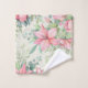 Este lindo conjunto de toalhas de banho apresenta delicadas flores cor-de-rosa, com um padrão de folhas verdes colocado sobre um fundo de cor de creme claro.