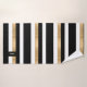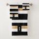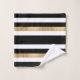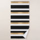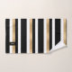 Toalha de banho moderna em preto, branco e dourado, com um padrão riscado horizontal a negrito. Uma placa decorativa em tons pretos e dourados, tem um monograma de uma letra branca e personalizado. Personalize a carta para atender às suas necessidades. A decoração do banho está disponível.