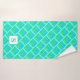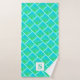 Este adorável conjunto de toalhas azul e verde dará uma brilhante pop de cor ao seu banheiro. O design apresenta um padrão abstrato de quadrados verdes azuis com pontos pretos. Pode-se monograma com a sua inicial desejada.