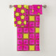 Um conjunto de toalhas coloridas, rosa quente e amarelas brilhantes. Inclui as variantes verificadas, de gravata e estrela da Coleção de Limonadas Rosa. Decoração vibrante do banheiro em fúcsia e amarelo-limão.
