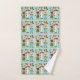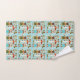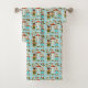 Toalhas e uma toalha de rosto apresentam um padrão divertido e colorido de ratos de desenho animado com roupas tradicionais e acentos florais em um fundo azul pastel.