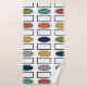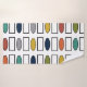 Este conjunto de toalhas tem uma toalha de banho com um design moderno do século médio de retângulos e ovais repetidos em cores retrorreflectoras, um pano de haste de tartaruga e uma toalha amarela.