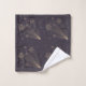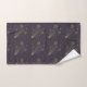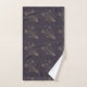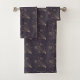 Toalhas roxas escuras e uma toalha de rosto apresentam um padrão delicado de estrelas cadentes douradas. O conjunto de toalhas está organizado de forma arrumada em uma prateleira metálica.