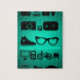 Cliparts pretos sobre as coisas home e várias: despertador, bicicleta, rádio, câmera, poltrona, tevê, vidros, etc. em um fundo brilhante bonito do verde azul.