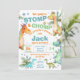 Entre em um mundo de diversão pré-histórica com o nosso convite de aniversário STOMP! e CHOMP! em tons azuis e verdes cativantes. Perfeito para crianças que adoram dinossauros, este convite personalizável prepara o cenário para uma celebração incrível. Adicione o nome da sua criança, detalhes da festa e uma mensagem pessoal para torná-lo único. Não perca essa oportunidade de criar um convite atraente que promete um tempo incrível – encomende agora para uma festa inesquecível!