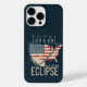 Legal design com um mapa dos EUA com a bandeira e a citação "Elipse solar total" e a data "4/8/24".