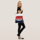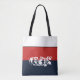 Este saco de tote de tamanho médio de na moda é mostrado em vermelho, branco e azul com faixa preta fina e alças em um bloco de cor listrado com o texto especial Vegas. Personalize este item ou comprar como está.