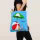 Um bolsa personalizado com letras azuis de escrita e praia ou arte temática de piscina de natação de uma bola vermelha de praia, guarda-chuva verde, sandálias de férias e óleo de bronzeado em um fundo azul-d'água com ondas.